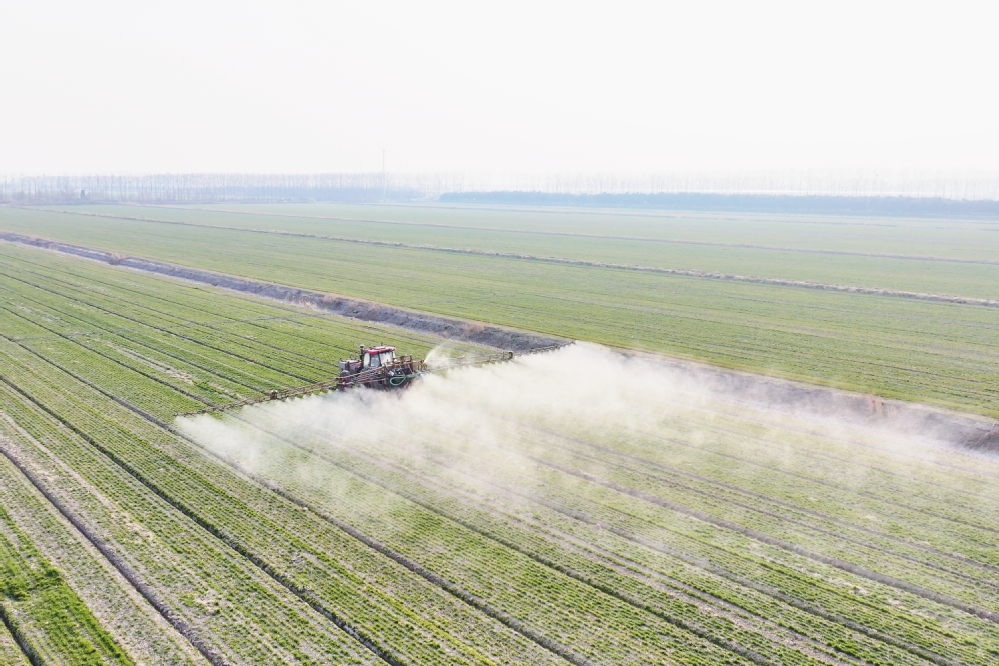 近日,随着气温回升,临海农场广袤的麦田里,春季田间管理工作正有序推进,一幅生机勃勃的农业生产画卷徐徐展开。