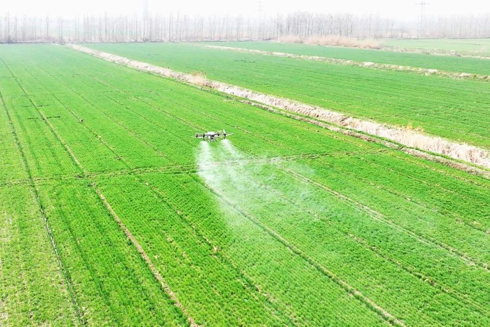 走进各生产区,一幅春日农忙图跃然眼前。田埂边,一台台植保无人机满电待发。随着飞手们的熟练操作,无人机在麦田上方来回穿梭,精准地将药液喷洒在麦苗上。