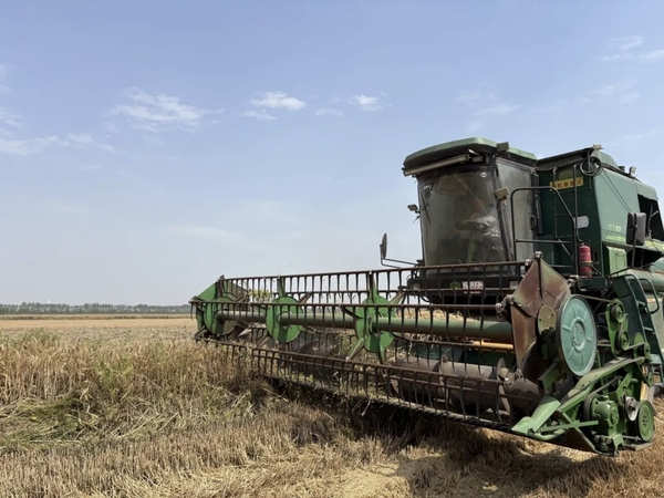 在三生产区,6台大型收割机正开足马力来回作业,沉甸甸的麦穗大口大口吞下,变成麦粒装进“肚子”;机身后方,打得粉碎的秸秆撒在地里。“今年我们采取‘人歇机不歇’的方式,24小时轮班作业。”生产区主任王爱东介绍,当前已进入芒种季节,田间小麦已全部成熟进入适收期,生产区严格按照“三夏”指挥部的部署要求,力争3个晴天将田间一万余亩小麦全部抢收登场,保质保量完成夏收任务。