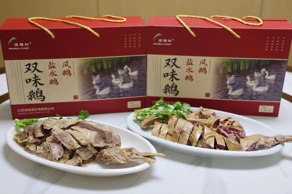 作为农场重点打造的特色产业,鹅养殖从单一养殖向全产业链延伸迈出关键一步。自启动特色种鹅养殖项目以来,临海农场立足自身繁育优势,深耕市场调研,聚焦农产品附加值提升,针对性开发鹅肉衍生产品。此次推出的“临海虹”双味鹅礼盒,正是农场针对春节消费市场打造的一款明星产品,将淮扬风味盐水鹅与风鹅巧妙融合,尽显地方美食特色。
